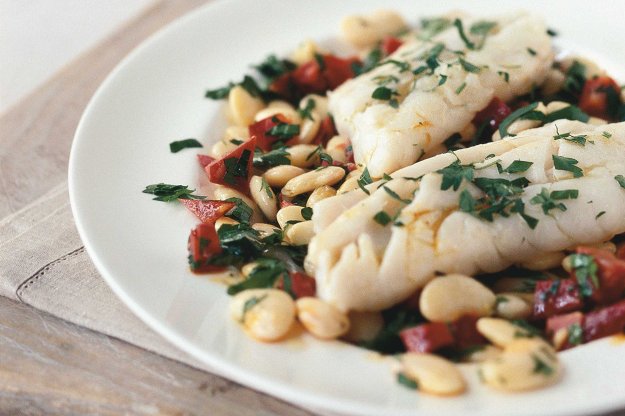 Fazole vsypte do misky vhodné do mikrovlnné trouby. Promíchejte s polovinou ochuceného oleje, polovinou petrželky a s chorizem. Navrch položte kousky ryby a zakápněte zbytkem směsi oleje a citronové šťávy. Misku přetáhněte fólií a tu na několika místech propíchněte. Čtyři až pět minut vařte v mikrovlnce na nejvyšší stupeň. Ryba by měla zprůsvitnět a maso se snadno oddělovat na lístky. Sejměte fólii, rybu dejte stranou na teplé místo; fazole s chorizem dobře promíchejte, rozdělte na talíře a navrch položte rybu. Posypte zbylou petrželkou a podávejte.