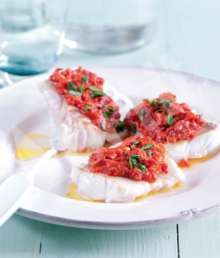Předehřejte troubu na 180 °C. Konzervovaná a sušená rajčata i s olejem, česnek a chilli papričku dejte do mixéru a rozmixujte na krémové pesto. Dosolte. Pestem potřete filety (pokud máte filety s kůží, potřete stranu bez kůže), položte je na pekáč a pečte 16 minut na prostřední mřížce rozehřáté trouby. Hotové filety vyjměte z trouby a nechte minutu odpočinout. Podávejte posypané petrželkou.