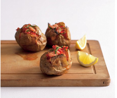 Na nepřilnavé pánvi zahřejte lžíci olivového oleje na středním plameni. Vsypte prolisovaný stroužek česneku a malou, najemno nasekanou červenou chilli papričku bez semínek a minutu prohřívejte. Přidejte 2 nasekaná rajčata a přilijte 60 ml vody. Za občasného míchání 5 minut vařte, aby rajčata změkla. Vsypte 12 nasekaných větších vyloupaných předvařených krevet (nebo 200 g menších krevetek), zamíchejte a nechte prohřát. Mezitím přidejte ještě 2 lžíce nasekaných bazalkových lístků, osolte a opepřete. Na 4 velké pečené brambory dejte po 1 vrchovaté lžíci zakysané smetany a navrch rozdělte krevetovou směs.