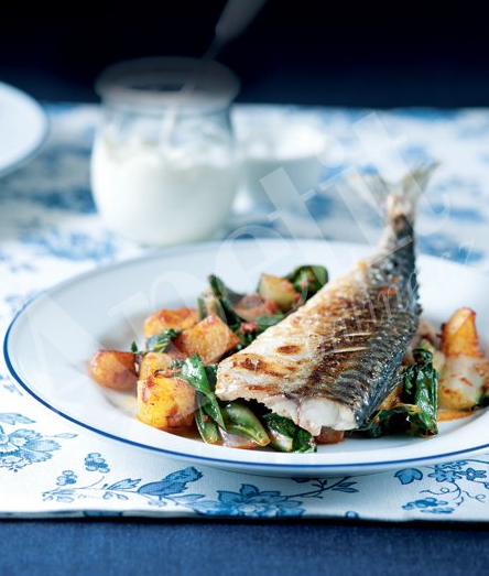 Z makrel odřízněte hlavu a odřízněte filety od páteře. Do kůže udělejte z boku 3 mělké zářezy, osolte, opepřete a potřete rybu jogurtem. Nechte 30 minut odpočinout. Troubu předehřejte na 200 °C. V zapékací nádobě na oleji brambory a cibuli opékejte 5 minut. Přidejte pokrájenou zelenou část mangoldu nebo špenát a kari a smíchejte. Dejte do trouby a pečte 15 minut. Pak na zeleninu položte makrelu a pečte dalších 15 dozlatova.