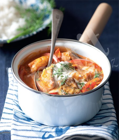 Zbavte kapra největších kostí a nakrájejte ho na kostky o hraně 2,5 cm. Osolte, opepřete a obalte je v hladké mouce. V oleji opékejte po částech 3–4 minuty dozlatova. Do kastrolu dejte cibuli a opékejte 3 minuty dosklovita. Přidejte nakrájenou papriku a míchejte další 4 minuty, až trochu změkne. Vmíchejte sladkou papriku a po minutě zalijte vínem. Přiveďte k varu a vařte asi 3 minuty, až se trochu odpaří. Vraťte kapra a přidejte bylinky, případně dosolte. Vmíchejte zakysanou smetanu a už jen prohřejte těsně pod bodem varu. Podávejte s dušenou rýží nebo s chlebem.