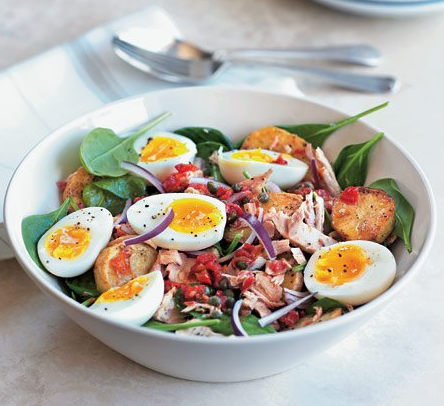 Zahřejte troubu na 200 °C. Brambory zakapejte 2 lžičkami oleje, dejte na plech a pečte 20 minut, v půlce obraťte. Brambory by měly být křupavé, zlaté a propečené. Mezitím dejte vejce do rendlíku s vodou, přiveďte k varu a vařte 4–10 minut, podle toho, jak je máte rádi. Pak je prolijte studenou vodou a nechte v ní chvíli stát. Oloupejte je a rozpulte. V salátové míse prošlehejte zbývající olej, ocet, kapary a nasekaná rajčata. Osolte a opepřete. Vsypte cibuli, špenát, tuňáka a brambory, jemně promíchejte. Navrch dejte vejce a hned podávejte.