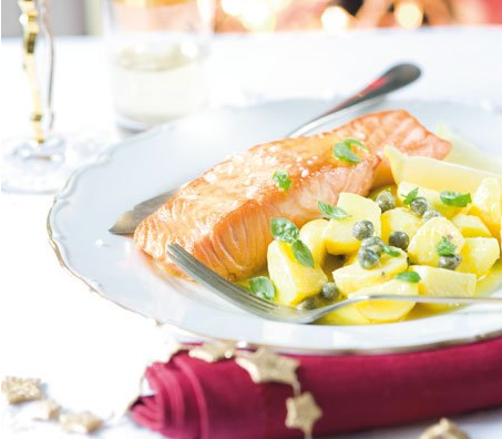 Troubu předehřejte na 170 °C. Lososa dobře osolte a opepřete a dejte ho do pevného plastového sáčku spolu s polovinou šťávy z citronu, veškerou šťávou z pomeranče a se 2 lžícemi olivového oleje. Uzavřete a nechte alespoň 10 minut marinovat. Pak rybu přendejte do pekáčku a pečte 6–8 minut. Losos po této době může působit nedopečeně, ale ještě ‚dojde‘ a zůstane šťavnatý. Brambory uvařte doměkka, slijte, nechte krátce zchladnout a oloupejte. Nakrájejte na kostky, osolte, opepřete a promíchejte se zbytkem šťávy z citronu, hořčicí, bazalkou a kapary. Nevadí, když se přitom brambory trochu rozmačkají. Podávejte s lososem přelitým vypečenou šťávou.