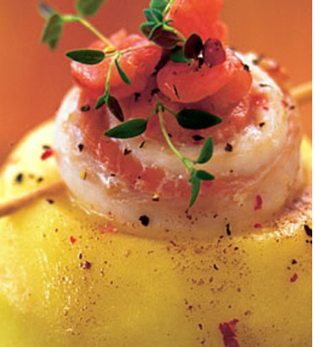 Nejdřív připravte vývar. Skrojky ryby (ocásky, ploutve, kosti) vařte dvacet minut v mírně osolené vodě a pak je přeceďte přes jemné síto. Oloupejte jablka, horní část asi ze třetiny seřízněte a jablko vydlabejte tak, aby vznikl jakýsi soudek o výšce 5cm. Troubu předehřejte na 200°C, horkovzdušnou na 180°C. Položte jablka na plech, rozdělte na ně 60g másla a pečte je tak čtvrt hodiny; musejí zůstat pěkně vcelku! Osolte a opepřete filátka, potřete je máslem a rozdělte na ně oloupané krevety. Poté filátka srolujte a přichytněte párátkem. Teplotu v troubě zvyšte o dvacet stupňů, závitky vložte do zapékací mísy, přelijte rybím vývarem a dejte do trouby. Pečte čtvrt hodiny. Pak závitek opatrně vložte do upečeného jablka. Zbylou šťávu ze zapékací mísy vlijte do kastrůlku, zaprašte moukou a za stálého míchání krátce povařte, aby vznikla hustá hladká omáčka. Přidejte zbylé máslo. Polovinu omáčky oddělte a vmíchejte do ní rajčatové pyré. Větší část obou omáček rozdělte na talíře a posaďte na ně ,soudečky‘ z jablek. Zakápněte bílou i červenou omáčkou a ozdobte nevyloupanými krevetami a bylinkami.