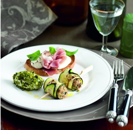 Jednu středně velkou cuketu nakrájejte na co nejtenčí podélné plátky, můžete použít škrabku na brambory nebo mandolínu. Druhou nakrájejte na nudličky julienne, osolte a nechte půl hodiny vypotit. V pánvi s vyšším okrajem rozehřejte 2 lžíce panenského olivového oleje, přidejte 1 nadrobno nakrájenou jarní cibulku, 2 sardelové řezy v oleji a vypocenou cuketu. Duste 15 minut, dokud se sardelky nerozpustí a neprolnou s ostatními přísadami. Opepřete, solit nemusíte, sardelky jsou velmi slané. Nechte vychladnout. V míse (můžete použít i mixér) smíchejte 160 g tuňáka v oleji s 1 vejcem, 1 lžičkou kaparů, 3 lžícemi strouhaného parmazánu a 2 lžícemi strouhanky, osolte a opepřete. Spojte vychladlou cuketovou směsí. Na každý plátek cukety naneste lžičkou směs, srolujte a postavte do zapékací mísy vymazané máslem a vysypané strouhankou. Troubu předehřejte na 190 °C. Závitky opřete o sebe, aby se nerozbalily. Každý závitek můžete také propíchnout párátkem anebo z nich vytvořte špízy – několik závitků propíchněte jehlou či špejlí. Vydatně zakapejte olivovým olejem a pečte asi 30 minut.