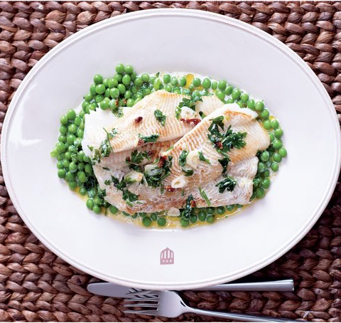 Připravte omáčku aglio e olio a na konci do pánve dejte rybí filety a přiklopte. Po 2 minutách obraťte a podlijte smetanou. Když je ryba měkká (trvá to asi 5 minut podle druhu ryby), vypněte. Mezitím uvařte hrášek na páře. Podávejte s rybou a přelité omáčkou.