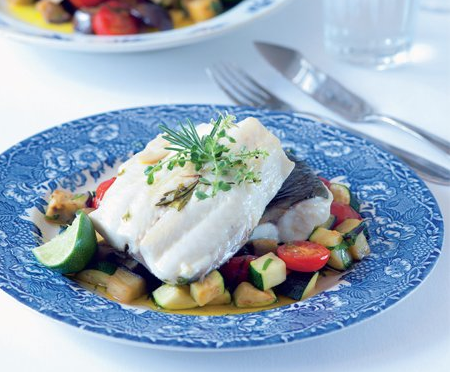 Kostky lilku osolte a nechte 15 minut vypotit. Potom je osušte a opečte na lžíci tuku v pánvi. Přidejte cuketu a rajčata a ještě chvíli opékejte. Stáhněte z ohně, vmíchejte bazalku a osolte a opepřete. V hlubší pánvi zahřejte těsně pod bod varu (na 90 °C) olej s bylinkami. Vložte porce amura a pošírujte je asi 5 minut. Vyjměte rybí lopatkou, osolte, opepřete a podávejte se zeleninou a klínky limety.