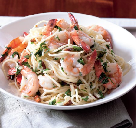 Špagety uvařte podle návodu na obalu. Začněte připravovat omáčku aglio e olio a na konci do ní přihoďte krevety a osolte. Míchejte na prudkém plameni asi 1 minutu, až budou krevety hotové. Promíchejte se scezenými uvařenými špagetami a můžete podávat posypané parmazánem, Ital by ale těstoviny s plody moře jedl bez něj.