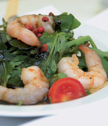 Rukolu, křehký lahodný salát s lehce nahořklou chutí, pokapejte olivovým olejem, přidejte balzamikový ocet, osolte, opepřete směsí pepřů a přidejte několik kapek limetkové šťávy. Množství soli, pepře a limetky závisí pouze na vaší chuti. Pepř je ovšem ideální použít čerstvý, různobarevný, a na salát jej přímo namlít. Zbylými kuličkami pak můžete ozdobit už hotové porce. Ochucenou rukolu rozdělte na talíře a ozdobte ji rozpůlenými cherry rajčátky. Svou barevností se postarají o estetický zážitek a podnítí chuť k jídlu. Na závěr připravte krevety. Při tepelném zpracování by neměly zgumovatět, ale zůstat křehké. Toho docílíte jediným způsobem: osmahnutí by nemělo trvat déle než minutu. Na rozpálenou pánev vlijte trochu olivového oleje, rychle vhoďte krevety, okořeňte je chilli a zakápněte citronovou šťávou a kvalitním bílým vínem. Salát můžete servírovat jako předkrm, ale úspěch bude určitě slavit i jako lehké hlavní jídlo.