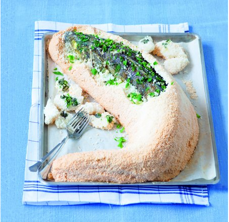 Candáta omyjte studenou vodou a osušte. Troubu rozpalte na 180 °C a plech vyložte pečicím papírem. Bílky vyšlehejte dotuha a rukou do sněhu zapracujte sůl a mouku – vytvoříte směs, která bude držet tvar. Část směsi naneste na plech potažený pečicím papírem – hmota by měla kopírovat tvar ryby. Do břicha candáta vložte estragon a polovinu petrželky. Rybu ,postavte‘ břichem na stůl a rovnoměrně ji obalte zbylou hmotou. Pečte, dokud krusta neztvrdne (30–40 minut, podle váhy ryby), a vyjměte z trouby. Nechte 10 minut stát a pak opatrně krustu rozbijte a odstraňte. Kůži stáhněte od ocasu vidličkou a candáta polijte máslem a posypte petrželkou. Maso odloupněte od páteře a velkých kostí a podávejte.