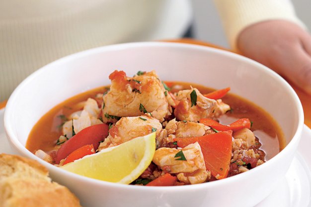 Olej zahřejte v kastrolu. Vsypte česnek, kmín; po minutě opékání přidejte sladkou papriku. Vše zalijte 100 ml vody a rajčaty. Uveďte do varu a pak plamen snižte. Přihoďte nakrájenou papriku a zlehka asi pět minut poduste. Pak přidejte rybu, osolte a ještě pět minut duste. Podávejte posypané koriandrem a se skrojkem citronu.