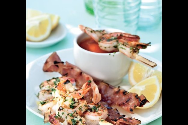 Na omáčku rozmixujte rajčata a česnek. Směs protřete sítem, abyste odstranili slupky a semínka. Hustou šťávu vraťte do mixéru a přidejte pečivo. Promixujte a nechte 15 minut odpočívat. Osolte a pak za stálého mixování přilévejte olej a 40 ml ledové vody, až bude omáčka hladká a sametová. Krevety oloupejte, ale ponechte jim ocásek, a smíchejte je s česnekem, polovinou petrželky, citronovou šťávou a olivovým olejem. Osolte a napíchejte po čtyřech na špejle. Grilujte krevety a vedle slaninu 2–3 minuty po každé straně nebo dozlatova. Omáčku salmorejo rozdělte do misek, aby si v ní krevety a slaninu mohl každý namáčet.