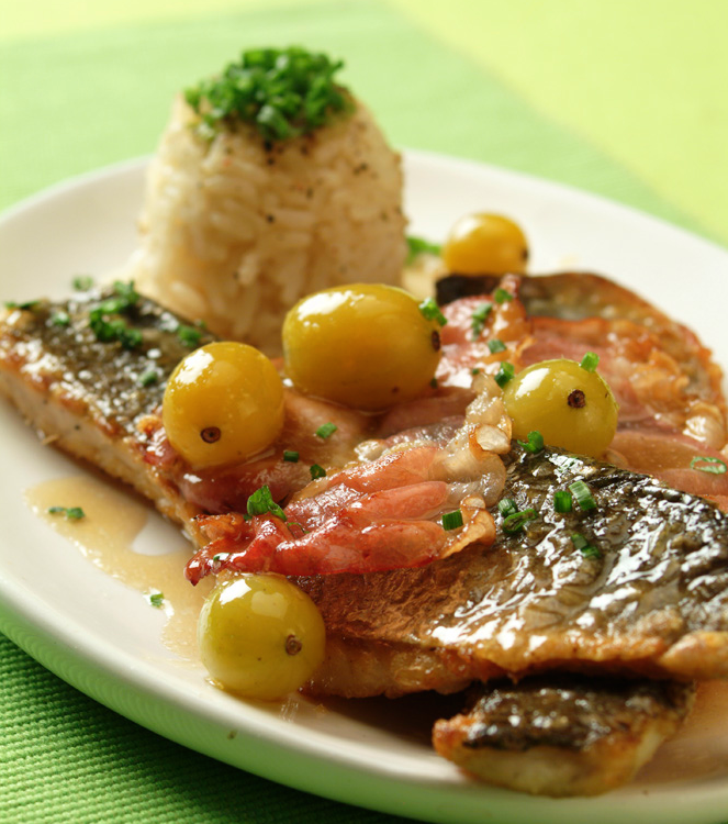 Porce rybího masa očistíme a opláchneme studenou vodou. Osolíme je, opepříme, pokapeme limetkovou šťávou a necháme 10 minut odpočinout. Mezitím na lžíci rozehřátého oleje zesklovatíme oloupanou a jemně nakrájenou šalotku, přidáme dvě třetiny očištěného angreštu, lžičku cukru a bílé víno, promícháme a prudce svaříme, až se polovina tekutiny odpaří. Pak směs prolisujeme přes cedník nebo rozmixujeme ponorným mixérem a omáčku uložíme v teple. Porce ryby vložíme do vhodné větší pánve s rozpáleným zbylým olivovým olejem a opečeme je ze strany kůže dozlatova a křupava. Otočíme je, vedle ryb rozložíme plátky šunky a zbylé kuličky angreštu, vše vložíme do trouby vyhřáté na 220 °C a zapečeme 3 minuty. Rybí porce rozdělíme na talíře, překryjeme je rozpečenými plátky šunky, doplníme omáčkou a několika kuličkami angreštu z pánve a ihned podáváme. Vhodnou přílohou jsou opečené brambory, rýže nebo bageta.