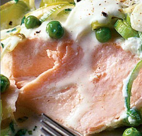 Ryby z obou stran poprašte solí a pepřem. Pórkům odkrojte kořínky a zbavte je poškozených částí. Pak pórky podélně rozřízněte, důkladně propláchněte a příčně co nejjemněji nakrájejte. Z pečicího papíru ustřihněte čtyři čtverce o straně 40cm a do středu položte plátek ryby. Na ten navršte hrášek, nakrájený pórek a dvě lžíce zakysané smetany. Posypte koprem a ještě trochu osolte a opepřete. Vytvořte balíčky a položte je na talíř v mikrovlnné troubě. Vařte pět minut při nejvyšším výkonu. Papír odstraňte a rybu podávejte se zbylou smetanou. Nejlepší přílohou jsou vařené (nové) brambory.