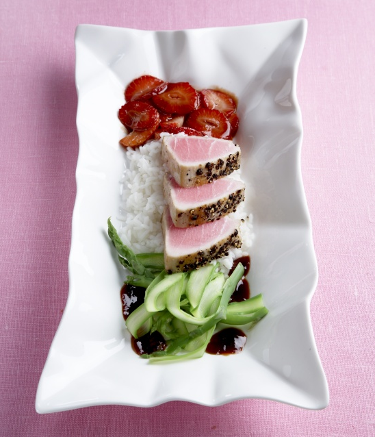 Filet z tuňáka opláchneme vodou, osušíme a nakrájíme podélně na špalíky, které z jedné strany přimáčkneme na talířek posypaný drceným pepřem a uložíme v chladu. Polovinu jahod rozmixujeme, propasírujeme a nalijeme do kastrůlku. Přidáme sójovou omáčku s medem a za stálého míchání svaříme, až směs zhoustne. Vmícháme do ní olivový olej a uložíme v teple. Odleželé špalíčky tuňáka zprudka opečeme ze všech stran na pánvi z olejem (špalíčky otočíme vždy, když se na opékané straně vytvoří asi 2 - 3 mm silná šedivá vrstva). Takto připravené rybí maso uložíme v teple. Druhou polovinu jahod očistíme, nakrájíme na plátky a krátce orestujeme v malém kastrůlku na rozehřátém olivovém oleji. Chřest očistíme, stonky odřízneme, spodní třetinu stonků oloupeme škrabkou a stonky nakrájíme podélně na plátky. Hlavičky chřestu i nakrájené stonky vhodíme do vroucí osolené vody a jen krátce necháme spařit. Orestované jahody rozdělíme na nahřáté nalíře, přidáme porce rýže a tuňáka nakrájeného na plátky, doplníme spařeným a odkapaným chřestem a jahodovou omáčkou a ihned podáváme.
