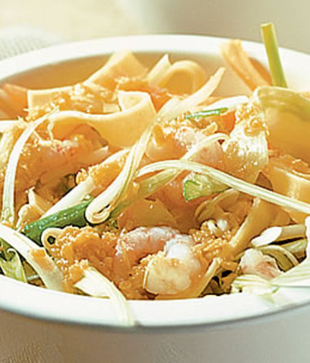 Fazolové klíčky vložte do misky a na 10 minut je ponořte do studené vody (budou křupavější). Ve velkém hrnci mezitím uvařte podle návodu nudle. Nudle sceďte a zchlaďte studenou vodou z kohoutku. Nechte dobře okapat. Vsypte je do mísy a smíchejte s mrkví, jarní cibulkou, okurkou, krevetami a fazolovými klíčky. Na zálivku smíchejte slunečnicový olej, sójovou omáčku, ocet, zázvor, česnek a med. (Jestli pokrm připravujete na později, můžete v téhle fázi uložit salát i zálivku – zvlášť! – do ledničky.) Před podáváním salát přelijte zálivkou a lehce promíchejte. Nakonec ho ještě zakapejte sezamovým olejem.