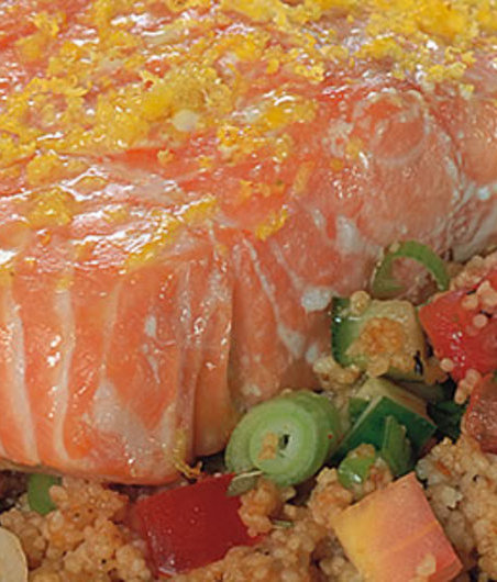 Troubu předehřejte na 200, horkovzdušnou na 180 stupňů. Rybu položte na plech vyložený pečicím papírem, postrouhejte ji citronovou kůrou, osolte a opepřete. Zakápněte jen trochou oleje – losos je sám o sobě dost tučný. Pečte deset až dvanáct minut, záleží na velikosti a výšce plátku. Kuskus nebo bulgur (k mání jsou i ochucené verze) zvláční velmi rychle, buď po velmi krátkém povaření nebo pouhém zalití vroucí vodou; prostudujte si návod. Vsypte do mísy, zalijte vodou a nechte po uvedenou dobu stát, dokud zrnka nevsáknou všechnu tekutinu. Základ salátu je hotov! Zeleninu důkladně opláchněte a jemně nakrájejte: jarní cibulku na kolečka (zpracujte i tmavší zelenou část natě), okurku podélně rozčtvrťte (můžete seříznout část se semínky) a nakrájejte na plátky, rajčata taky na plátky nebo na kostičky. Všechnu zeleninu pak vmíchejte do kuskusu. Suroviny na zálivku prošlehejte v misce vidličkou, takže vznikne jakási emulze. Spolu s bylinkami (sušené rozemněte) vmíchejte do salátu a podávejte k rybímu filetu. Salátu neuškodí, ani když ho necháte stát do druhého dne, samozřejmě v chladu – aspoň se dobře rozleží chutě.