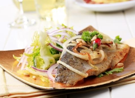 Očištěnou a vykuchanou rybu pečlivě osušte, nařízněte podél páteře a do osolené břišní dutiny vložte bylinky, plátky citrónu a cibule. Rybu potřete olejem, zakápněte citrónovou šťávou, posypte zbylými bylinkami, dejte na plech pokrytý pečícím papírem spolu s rajčaty a grilujte v troubě nebo na grilu asi půl hodiny.