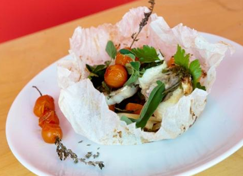 Filety očistíme a lehce nasolíme. Brambory, rajčata, celer, mrkev, pórek, česnek a cibuli nakrájíme na plátky cca 1cm silné. Rozmarýn, bazalku a petržel nasekáme na jemno. Zeleninu lehce nasolíme, zakapeme olivovým olejem a promísíme. Pečící papír rozřežeme na 4 čtverce cca 35cm velké, na střed každého papíru klademe nakrájenou zeleninu. Na ni položíme filátka candáta, posypeme bylinkami a přidáme plátek másla. Poté rohy každého čtverce přiložíme k sobě, vytvarujeme měšec a nití zauzlujeme. Takto připravené maso pečeme v troubě pod grilem cca 30 - 40 minut. Cherry rajčátka napichujeme na větvičky tyminánu. Poté je zakapeme olivovým olejem, opepříme, dochutíme solí a ogrilujeme. Po změknutí je podáváme s bylinkami a filety, které zbavíme papíru.