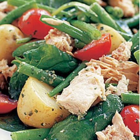 Brambory vložte do hlubokého hrnce s vroucí vodou a vařte deset až patnáct minut, dokud nezměknou. Mezitím udělejte zálivku – smíchejte pesto a olej. Rajčata rozpulte, tuňáka vyklopte z konzervy a rozdrolte. Fazole přidejte na poslední tři minuty vaření k bramborám. Brambory s fazolemi slijte, osušte a nasypte do salátové mísy. Vmíchejte špenát, aby se od zeleniny trochu ohřál. Osolte a opepřete. Rajčata a tuňáka nasypte navrch, všechno pokapejte pestovým dresinkem a jemně promíchejte.