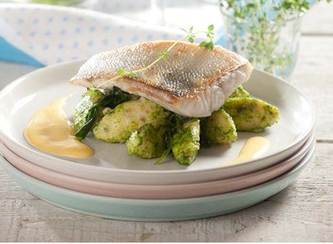 Nejdříve připravíme noky. Brambory uvaříme ve slupce doměkka. Špenátové listy podle potřeby zbavíme dlouhých stonků a listy spaříme ve vroucí osolené vodě. Scedíme je, ihned zchladíme ve studené vodě, z listů opatrně vymačkáme vodu a nakrájíme je nahrubo. Uvařené brambory zchladíme, oloupeme a prolisujeme nebo nastrouháme do mísy. Přidáme k nim celá vejce, žloutky, mouku, solamyl, nastrouhaný parmazán, oloupaný a nastrouhaný stroužek česneku, osolíme a těsto lehce propracujeme. Přidáme nakrájený špenát, těsto opět opatrně propracujeme a necháme asi 10 minut odležet. Pak z těsta lžící vytvarujeme noky, opatrně je vkládáme do většího množství vrocí osolené vody a vaříme 10 minut. Připravíme žloutkovou omáčku. Oloupanou a drobně nakrájenou cibuli a lžíci pažitky zalijeme 5 lžícemi vody, octem a vínem, přidáme cukr a podusíme 2 minuty bez pokličky. Žloutky rozšleháme se solí a pepřem, po kapkách vešleháme olej, pak rozehřáté máslo a nakonec cibulovou směs a nasekaný estragon. Stejnoměrné porce candáta osolíme, opeříme a zprudka opečeme na másle kůží dolů (asi 5 - 6 minut). Pak je obrátíme, vypneme plamen a maso necháme dojít. Na talíře rozdělíme bramborové noky, položíme na ně porce candáta a přelijeme žloutkovou omáčkou.