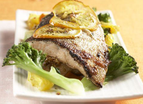 Porce lososa opláchneme, osušíme, potřeme sójovou omáčkou smíchanou se šťávou z jednoho pomeranče a necháme v chladu alespoň 20 minut odležet. Brokolici omyjeme a rozdělíme na růžičky, karotku nakrájíme na plátky. V hrnci přivedeme k varu osolenou vodu, přidáme plátky mrkve a povaříme je asi minutu. Pak přidáme růžičky brokolice a vaříme společně další minutu. Zeleninu ihned prudce zchladíme v ledové vodě a necháme odkapat. Odleželé rybí porce zprudka opečeme z obou stran v pánvi na oleji, přeložíme do pekáčku, poklademe plátky z druhého dobře omytého pomeranče a vložíme na 8 - 10 minut do trouby vyhřáté na 160 °C. Odkapanou karotku s brokolicí krátce prohřejeme na rozehřátém másle, rozdělíme na talíře, přidáme porce lososa a podáváme s vařenými nebo pečenými brambory.