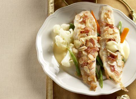Karotku nakrájíme na silnější dlouhé nudličky, společně s fazolkami a růžičkami květáku povaříme v hrnci s osolenou vodou tak, aby zelenina zůstala tuhá a odstavíme z ohně (nesléváme ji). V kastrolu připravíme z másla a mouky světlou jíšku. Zalijeme ji studeným vývarem, rychle rozšleháme a za stálého míchání přivedeme k varu. Přidáme šťávu z limetky, necháme přejít varem, přilijeme žloutek rozmíchaný ve smetaně, osolíme a necháme asi 15 minut provářet (Je-li omáčka moc hustá, zředíme ji trochou vývaru ze zeleniny). Ve větší ploché misce smícháme vejce se škrobem a půlkou lžičky soli. Touto směsí potřeme omytá a osušená rybí filátka a necháme je v míse odležet. V pánvi opečeme zvolna na nudličky nakrájenou slaninu a necháme ji odkapat na papírové utěrce. Rybí filátka zprudka opečeme z obou stran v pánvi na oleji, přeložíme je na plech, posypeme slaninou a mandlemi a pečeme v troubě při 170 °C asi 10 - 12 minut (podle tloušťky filátek). Zeleninu v hrnci zprudka prohřejeme, scedíme a rozdělíme na talíře. Přidáme filátka a vše doplníme teplou omáčkou. Jako přílohu podáváme vařenou nebo dušenou rýži.