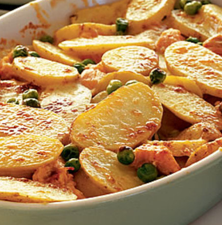 Brambory zalijte vařící osolenou vodou (tak uchováte cenné látky) a vařte celkem deset minut, aby změkly, ale nerozpadaly se. Po osmi minutách varu k nim přisypte hrášek. Sceďte brambory s hráškem a nechte je trochu oschnout. Pak je vsypte do vymaštěné zapékací misky a trochu urovnejte, aby byly rozložené stejnoměrně. Rozpalte gril nebo předehřejte troubu na nejvyšší teplotu.