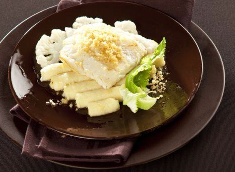 Květák zbavíme listů a tvrdého košťálu, oddělíme z něj 6 největších růžiček a pokud má, tak i zachovalé křehké lístky. Růžičky květáku uvaříme do poloměkka v osolené vodě a ke konci přidáme i odložené lístky. Vyjmeme je, necháme odkapat a odložíme stranou. Do vývaru z květáku vložíme zbylý květák nakrájený na kousky, uvaříme je doměkka a necháme stát. Brambory nakrájíme na kousky a vložíme do vařící se osolené vody. Když jsou měkké, scedíme je, necháme z nich uniknout páru a ihned je prolisujeme přes jemné síto. Kousky květáku scedíme, rozmixujeme se smetanou, přivedeme k varu a zvolna vaříme, dokud směs nemá kašovitou konzistenci. Odstavíme ji, přidáme prolisované brambory, ochutíme pepřem a muškátovým květem a opatrně promícháme. Toastový chléb nasekáme v sekacím strojku na drť a osmahneme ji dozlatova na lžíci oleje. Přimícháme nastrouhanou citronovou kůru a parmazán a směs necháme vychladnout. Filety opláchneme, osušíme a zprudka opečeme z jedné strany v pánvi na zbylém rozpáleném oleji. Po otočení filety osolíme, lehce pokapeme citronovou šťávou a zvolna pečeme asi 5 - 8 minut (podle síly filetů). Uvařené růžičky květáku podélně překrojíme a prohřejeme spolu s květákovými lístky na másle. Připravenou kaši naplníme do cukrářského sáčku a nastříkáme na talíře. Přidáme prohřáté růžičky a lístky květáku, položíme na ně filety a posypeme je strouhankou s parmazánem.
