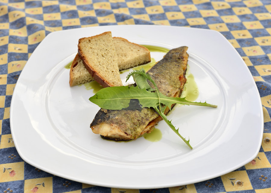 Filety ze pstruha posypeme hořčičným semínkem, paprikou, solí, spojíme stranou masa k sobě a obalíme v hladké mouce. Poté pstruhy opečeme na másle z obou stran dozlatova. Při servírování je na talíři zakápneme dýňovým olejem. Podáváme s pečivem a listovým salátem.