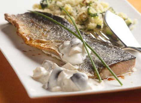 Do kastrolu nasypeme oloupanou, jemně nakrájenou cibuli, zalijeme ji vývarem a citronovou šťávou a pomalu necháme svařit na čtvrtinu původního množství. Pak přimícháme zakysanou smetanu a omáčku už jen zvolna prohřejeme. Houby očistíme, nakrájíme na kousky a zprudka je opečeme na polovině oleje. Osolíme je, přidáme jemně nakrájený česnek, společně krátce podusíme a pak houby přimícháme do připravené smetanové omáčky a uložíme ji v teple. Rybí filátka na straně bez kůže lehce osolíme a touto stranou je položíme na plech vytřený zbylou polovinou oleje. Vložíme je do trouby vyhřáté na 220 °C a upečeme je dozlatova. Rozdělíme je na talíře a každou porci přelijeme teplou omáčkou s houbami.