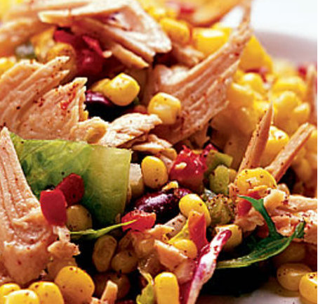 V míse promíchejte odkapaného tuňáka se zeleninou. Osolte, opepřete a navršte na salátové listy na talíři. Zakapejte olejem a citronovou šťávou a poprašte chilli. Podávejte s opečenou vekou nebo bagetou.