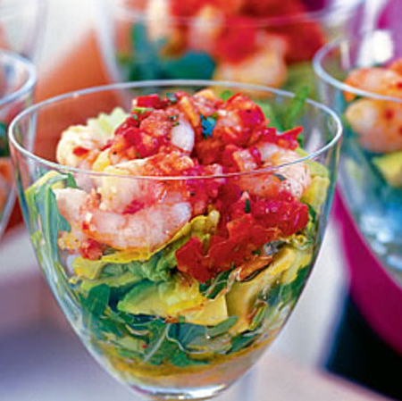 Použijete-li krevety zmražené, nechte je nejprve rozmrznout a pak je pečlivě osušte v utěrce, aby olej při smažení neprskal. Česnek jemně nakrájejte stejně jako chilli papričku, z níž jste předem odstranili semínka. Krevetky promíchejte s česnekem a chilli a pak je smažte asi 2–3 minuty na lžíci oleje, aby zůstaly hezky růžové. Přendejte je do misky, nechte vychladnout a uchovejte v chladničce až do doby před podáváním. V misce rozšlehejte zbylé 4 lžíce oleje s medem a citronovou šťávou. Rajčata rozčtvrťte, vyjměte dužinu se semínky (můžete ji přidat k vývaru do ,Kypré rýže‘). Pevnou část rajčat nakrájejte na co nejdrobnější kousky a spolu s koriandrem nebo petrželkou je přidejte k ochucenému oleji. Směs prošlehejte metlou, až trochu zhoustne. Naložená rajčata rovněž uchovejte (klidně i několik hodin) v chladu. Těsně před podáváním najemno pokrájejte avokádo (obejdete se i bez něj, ale kombinace máslové konzistence avokáda a jemných krevet je vynikající). Lístky salátu nebo rokety natrhejte na menší kousky a rozdělte je do sklenek (v nichž budete koktejl podávat). Na salát navršte krevetky a přelijte zálivkou. Podávejte s bagetou nebo chlebovými plackami. Ty nejlépe chutnají, když je potřené trochou oleje rozpečete v troubě.